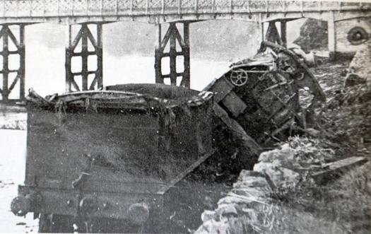 A wrecked goods train at Killurin, Co. Wexford (Engine No. 18). It was stopped by the anti-Treaty IRA on Wednesday night, the 11th of November 1922. They then removed its crew and sent the train steaming towards a point in the line where the sleepers had been removed. This caused the engine and two of the carriages to leave the tracks and roll down the embankment into the river Slaney. Attacks on the railway infrastructure were a characteristic feature of the the Civil War in Wexford, with numerous trains, bridges and tracks destroyed during the course of the conflict.
